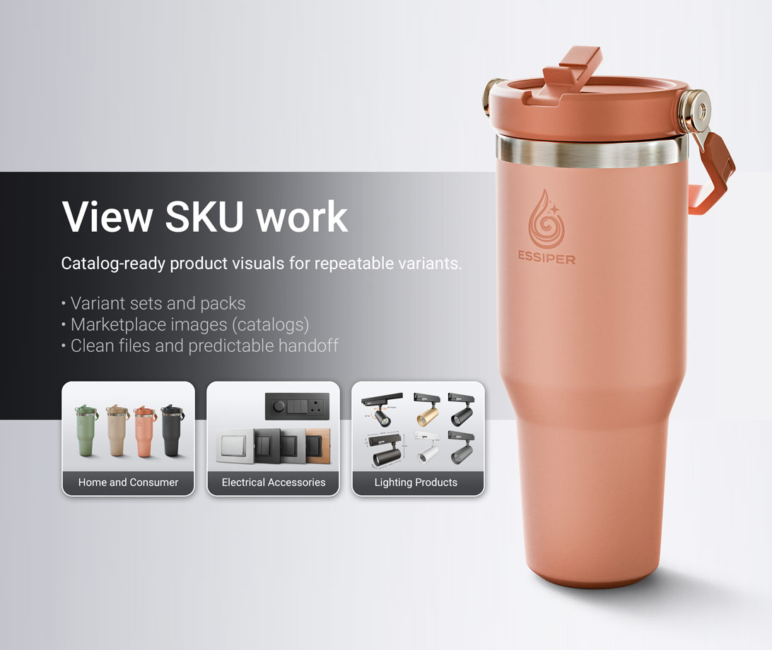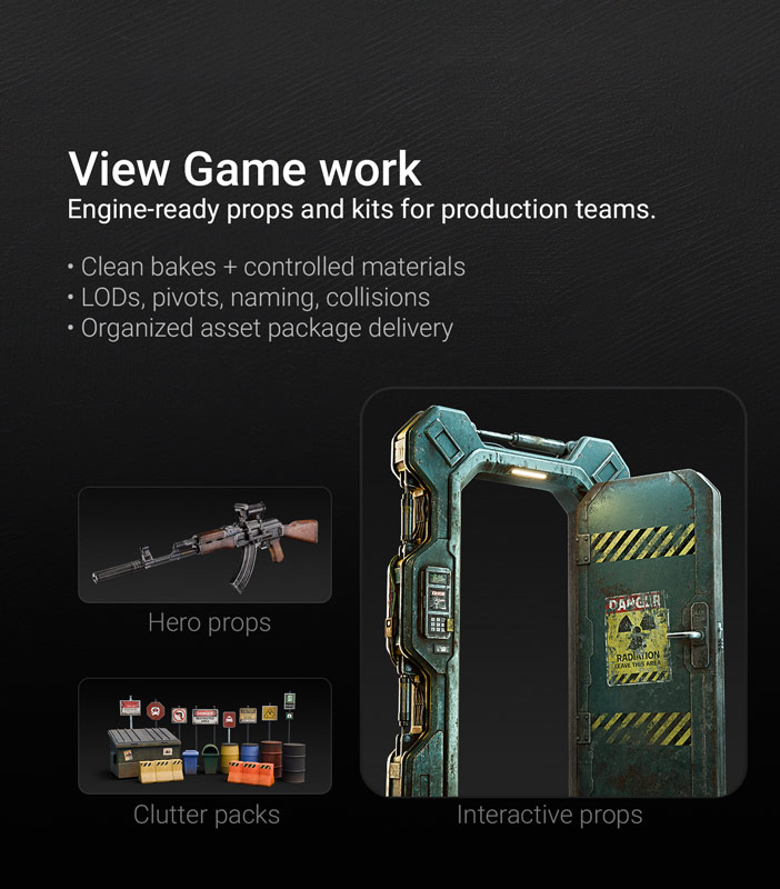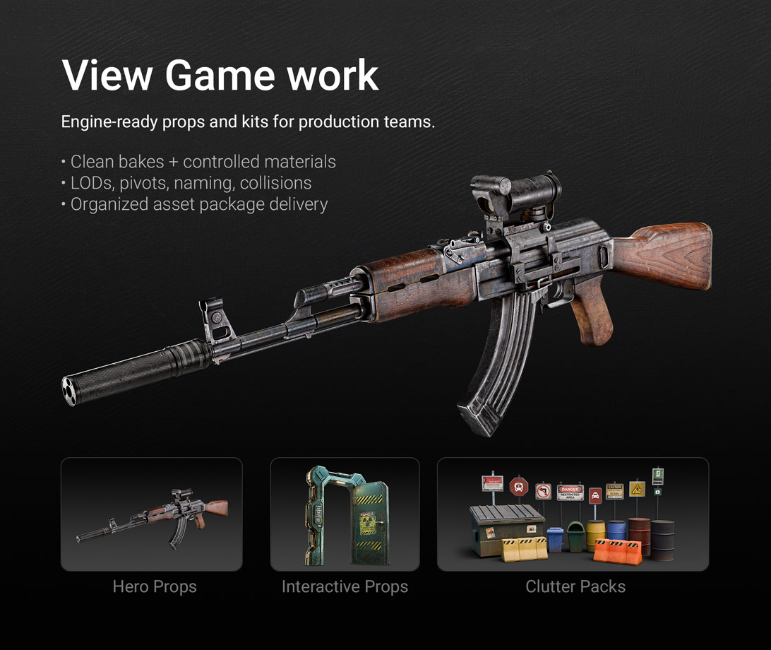 Engineering SKU product visualization + Game asset production. Built for clear inputs, predictable output, and clean handoff.